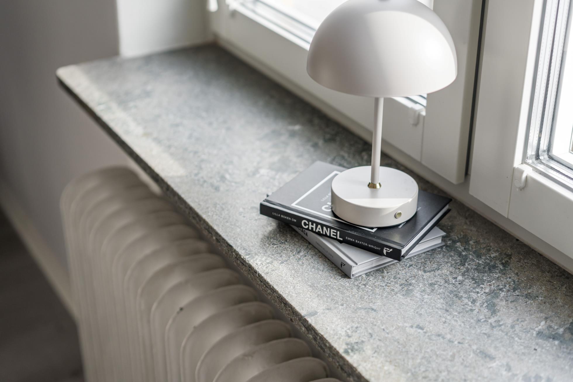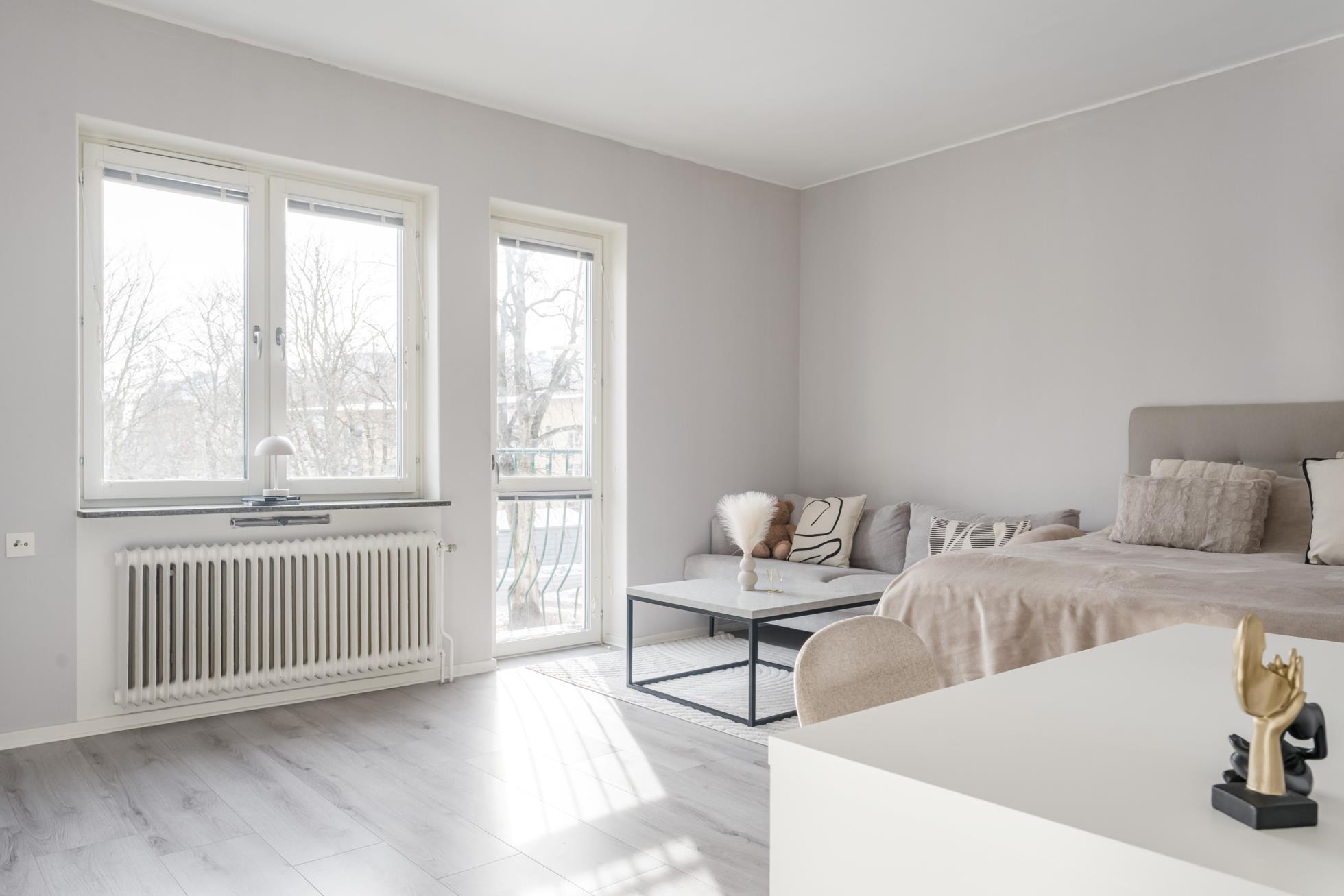 Det rymliga vardagsrummet rymmer enkelt både soffgrupp och säng, och tack vare fransk balkong samt fönster i sydostligt läge flödar rummet av härligt dagsljus.