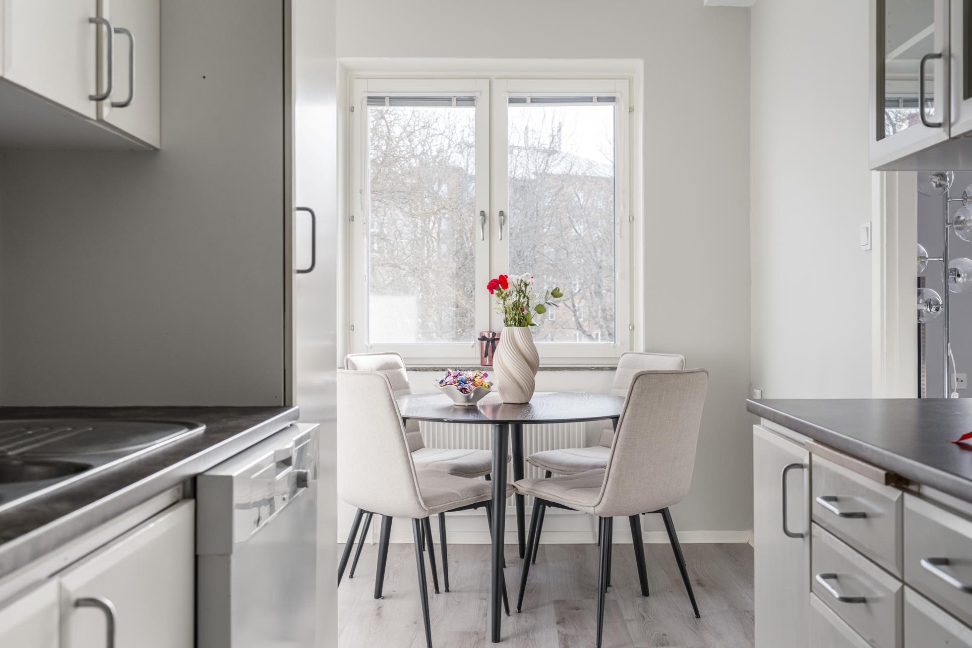 Köket är välplanerat med bra förvaring samt full maskinell utrustning – här finns dessutom en inbjudande matplats vid fönstret.